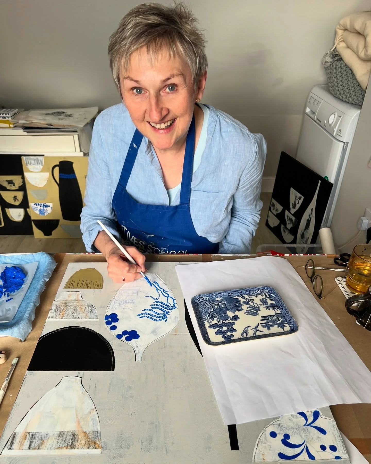 A tidy studio space is necessary before I start, tidying is not just the act of moving things into place but it’s also a way of clearing my mind to allow me to focus. I also need to wear leggings and a t shirt with my St Ives School of Painting apron, which is caked in years of paint. Finally I have a cup of green tea in a Nicola Gillis mug.